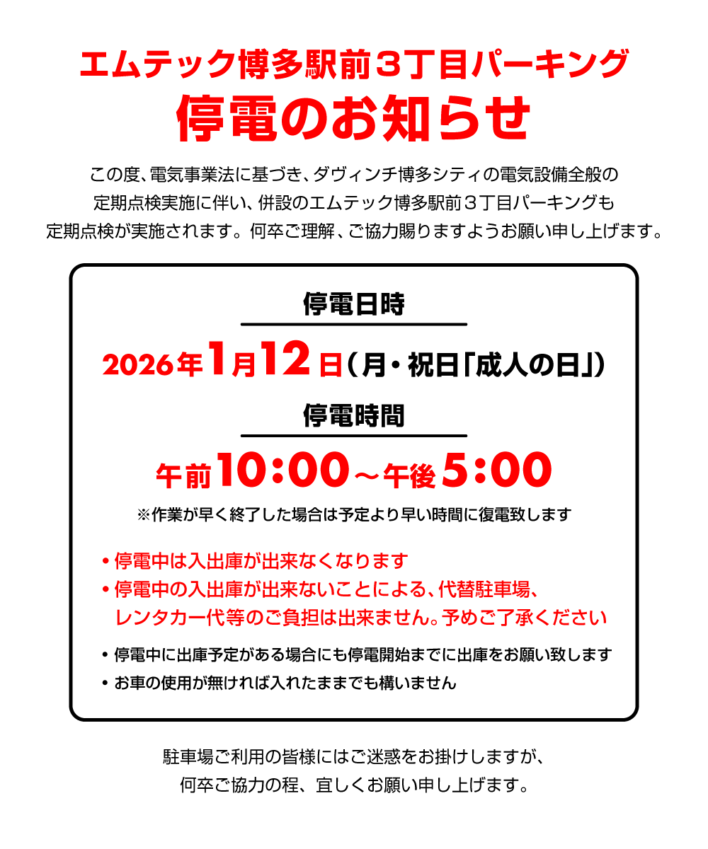 時間貸し駐車場は、上記の休業日程とは異なります。各駐車場の休業日に つきましては、恐れ入りますが直接各店舗 又は 当ホームページの駐車場情報ページにてご確認ください。